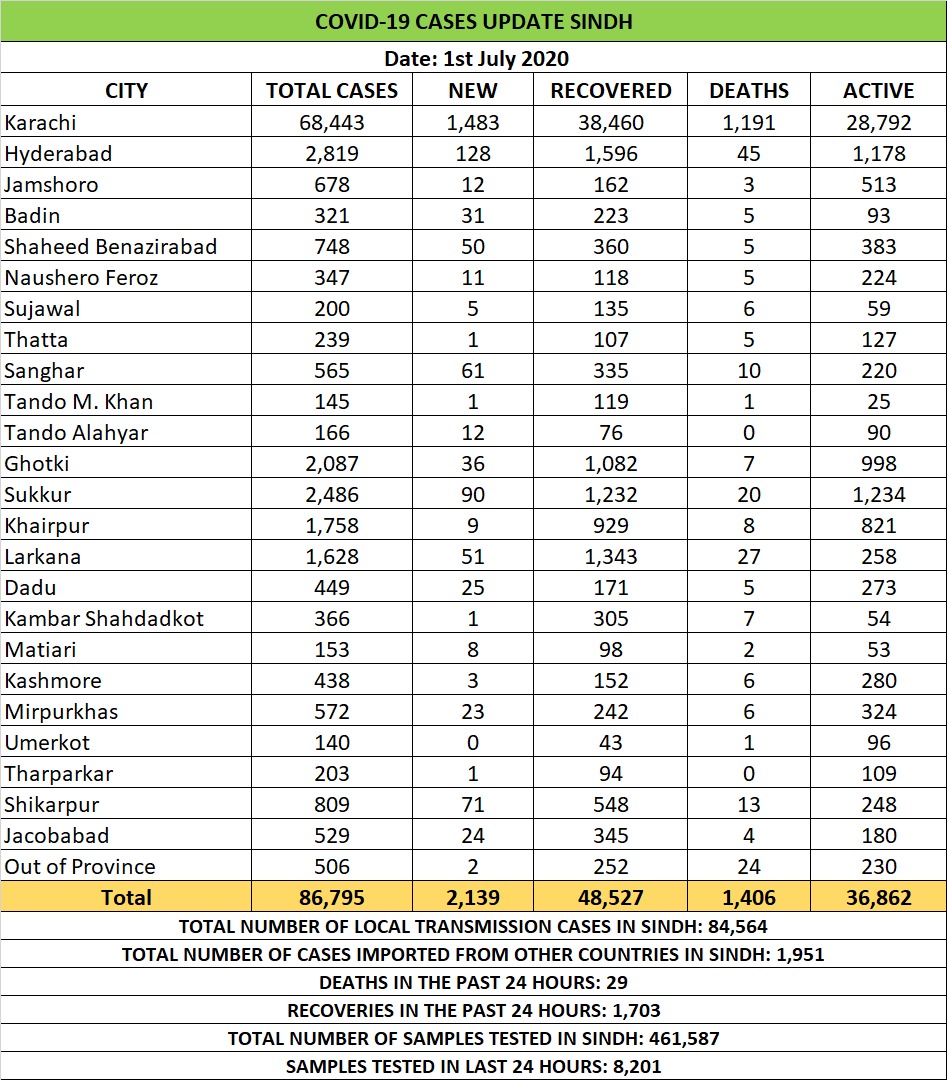 According to the health department data the rate of daily infection was 27%, against 28% of June 30. The number of COVID-19 cases rose to 68443 in Karachi, with 1483 new infections and overall death tally 1,191. In addition, Hyderabad reported 128 new cases, followed by Sukkur (90), Shikarpur (71), Sanghar (61), Larkana (51), Shaheed Benazirabad (50), Ghotki (36), Badin (32), Dadu (25), Jacobabad (24), Mirpurkhas (23), Jamshoro (12), Tando Allahyar (12), Naushero Feroze (11), Khairpur (9), Matiari (8), Sujawal (5), Kashmore (3), Thatta (1), Tando Mohammad Khan (1), Kambar Shadadkot (1) and Tharparkar (1)–PNFS