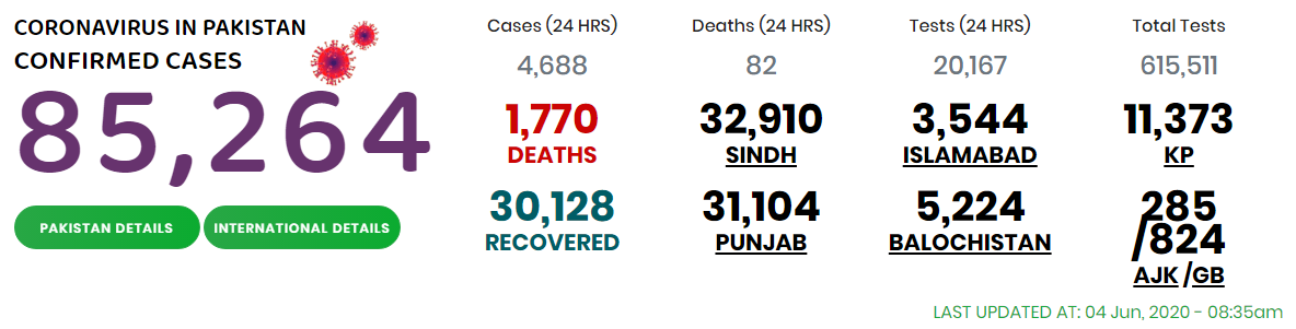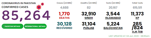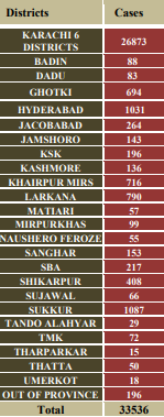 According to official data, the new infections reported on June 4 included 1,311 from Karachi, followed by Hyderabad (42), Ghotki (38), Kashmore (32), Khairpur (25), Sukkur (24), Larkana (22), Shaheed Benazirabad (21), Dadu (11), Sujawal (10), Badin (8), Jamshoro (7), Sanghar (5), Jacobabad (3), Tando Mohammad Khan (3), Umerkot (3), Matiari (1), Mirpurkhas (1) and Thatta (1).