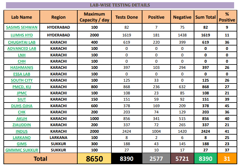 As of June 4, as per an official summary, DUHS Ojha facility, among the laboratories, conducted 378 tests, with a positive percentage of 45, followed by, Indus Hospital (41%), AKUH (40%), SIUT (39%), GMMC Sukkur (37%), CHK (36%), Chughtai Lab (36%). The overall positive rate remained 29%.