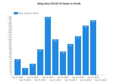 According to Sindh health department data, samples from 2,097 suspected patients were tested during the last 24 hours ending April 22 at 8 am, out of which 320 were found positive for COVID-19.