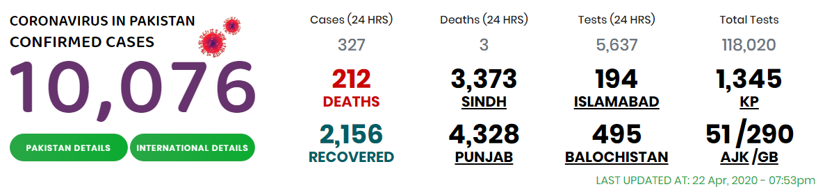 Similarly, the death of COVID-19 patients is also continuing unabated. Three more male patients, ageing 67, 60, 81, respectively died in public and private hospitals of Karachi on April 22. Prior to this, eight people had lost their lives to corona on April 19, five on April 20, and another five on April 21.