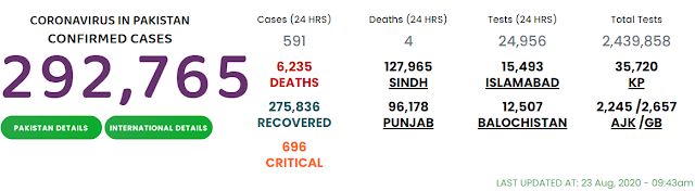 It was further learnt that the COVID-19 laboratories located at Karachi tested a total 4,200 samples during the last 24 hours, 2.61% of which were declared new positive cases, while the laboratories located outside Karachi in all handled 5111 samples and found 3.20% new infections.