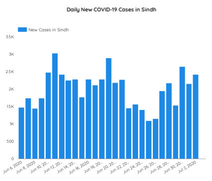 According to the daily COVID-19 summary issued by the Sindh health department on July 2 evening, Karachi districts collectively registered 1,700 new cases during the last 24 hours, followed by Hyderabad (89), Dadu 58), Ghotki (55), Thatta (51), Benazirabad (48), Tando Allahyar (47), Larkana (47), Naushero Feroze (41), Tando Mohammad Khan (37), Sukkur (37), Khairpur (37), Shikarpur (35), Sujawal (30), Matiari (21), Badin (18), Jacobabad (16), Jamshoro (19), Sanghar (15), Umerkot (13), Mirpurkhas (11), Tharparkar (2), Kambar Shahdadkot (1) and Kashmore (1).