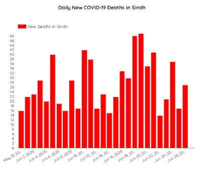 On June 26, Karachi reported 91% of the total Sindh cases, the highest proportion of new cases registered in the megapolis in recent days. The proportion of new cases recorded in the city on June 22 was 80% of the total Sindh cases, which had reduced to 45% on June 25.