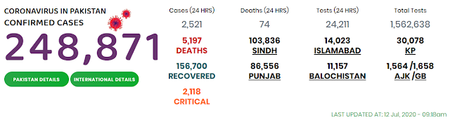 In the meantime, the Sindh Chief Minister, Syed Murad Ali Shah, in his routine COVID-19 statement on July 11, said that as many as 39,967 infected people were receiving treatment at homes, while another 402 were admitted to different isolation centres, in addition to 1265 hospitalized across the province, out of which 743 were in critical condition and 109 were put on ventilators.