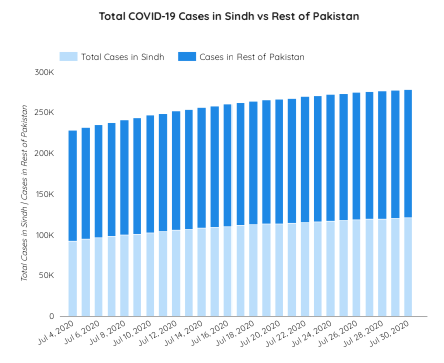 The World Health Organization (WHO) Sindh sub-office reported that as of July 29, as many as 9,520 samples were tested in the province during the last 24 hours, 5,508 tests at different laboratories of Karachi where positivity rate was 14%, 3,616 at Hyderabad, with a positivity rate of 5%, 173 at Larkana, with a positivity rate of 3%, and 223 at Sukkur, with a positivity rate of 2%.