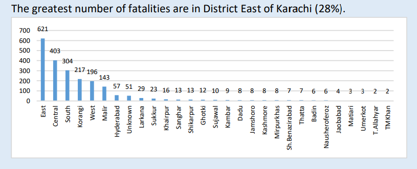 The report revealed that Karachi East district registered the greatest number of fatalities, ie 621 (28%), among districts, followed by District Central (403 deaths), South (304), Korangi (217), West (196), Malir (143), Hyderabad (57) and other districts.