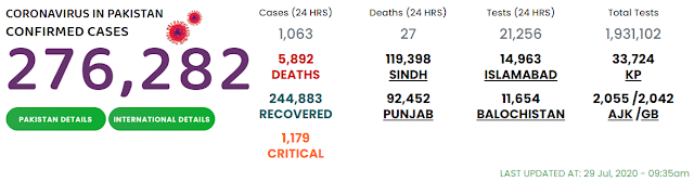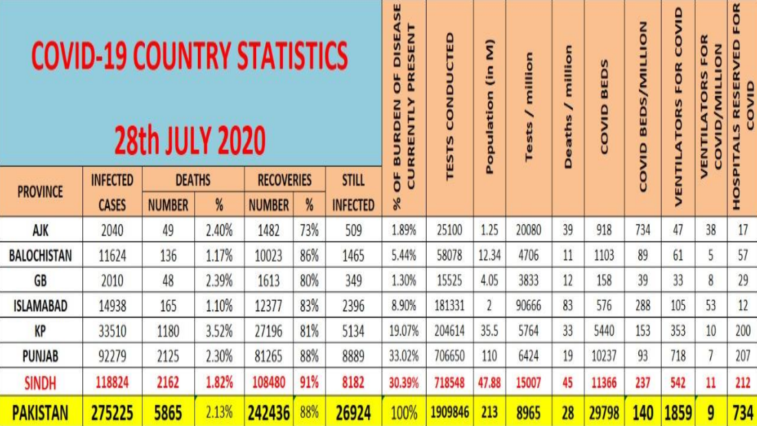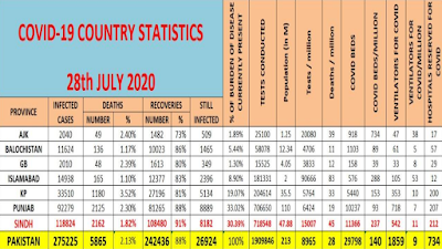 In the meantime, a Sindh health department website, updated late on July 28, showed a total 2,199 COVID-19 deaths, so far, in Sindh, with total infections of 119,337.
