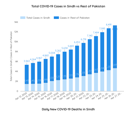 While the virus has spread in all districts, the breakdown of total reported cases was: Karachi-six districts (3,249), Sukkur (409), Hyderabad (263), Khairpur (169), Ghotki with no new case (124), Larkana (108), Shaheed Benazirabad reporting no new case (84), Tando Mohammad Khan with no new case (32), Sanghar (26), Naushehro Feroze (23), Shikarpur with no new case (17), Dadu (15), Jamshoro (15), Badin (15), Jacobabad with no new case (11), Sujawal with no new case (9), Mirpurkhas (9), Kashmore with no news case (9), Tando Allahyar (8), Thatta (6), Umerkot with no new case (4), Tharparkar with no new case (4), Kamber Shahdadkot with no new case (4) and Matiari (2).