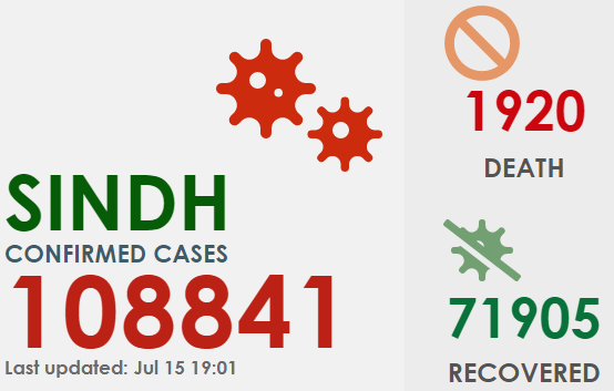 On July 15, Karachi reported 522 new cases, followed by Hyderabad (56), Tando Allahyar (36), Khairpur (35), Thatta (29), Naushero Feroze (27), Larkana (25), Jamhsoro (25), Shaheed Benazirabad (23), Sanghar (22), Sukkur (22), Shikarpur (20), Badin (18), Jacobabad (15), Tando Muhammad Khan (13), Dadu (12), Umerkot (12), Suijawal (11), Mirpurkhas (11), Matiari (7), Kambar Shadadkot (4), Ghotki (4) and Kashmore (2)–PNFS