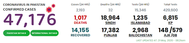 On May 21, Karachi reported 856 new infections, followed by Shikarpur (22), Hyderabad (17), Larkana (14), Kambar Shadadkot (9), Sukkur (9), Ghotki (7), Shaheed Benazirabad (3), Sanghar (3), Mirpurkhas (2), Jacobabad (2), while Jamshoro, Naushero Feroz, Sujawal and Dadu districts reported one new case each.