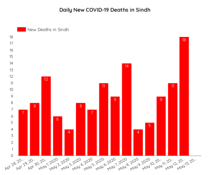 The latest one day’s death tally was the all days’ highest in the province. Earlier, Sindh reported a single day maximum 14 deaths on May 7, while on average nine deaths per day during the week from May 5 to 11.