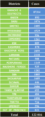 The district-wise breakdown of new cases resulted showed as Karachi (201), Shaheed Benazirabad (12), Hyderabad (9), Sukkur (7), Ghotki (6), Sujawal (6), Sanghar (5), Thatta (5), Larkana (4), Dadu (3), Jamshoro (3), Kashmore (3) and Badin (2).