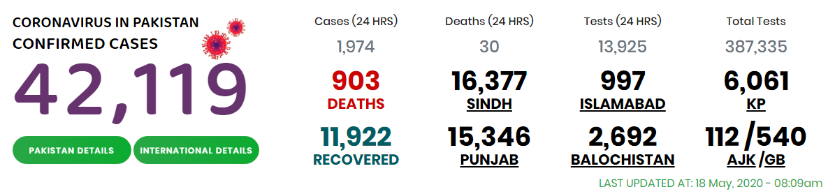 Among districts of Karachi, according to an official report updated on May 18, South housed the maximum 2,812 COVID-19 patients, followed by East (2,775 patients), Central (2,204), Malir (1,807), West (1,437) and Korangi (1,159).