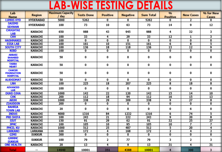 Karachi, in terms of new cases, was followed by Hyderabad (9), Thatta (8), Badin (7), Dadu (7), Larkana (6), Jamshoro (4), Shikarpur (3), Sukkur (3), Umerkot (2) and Shaheed Benazirabad (2) while Mirpurkhas and Sanghar reported one cases each, among other districts.