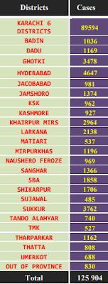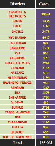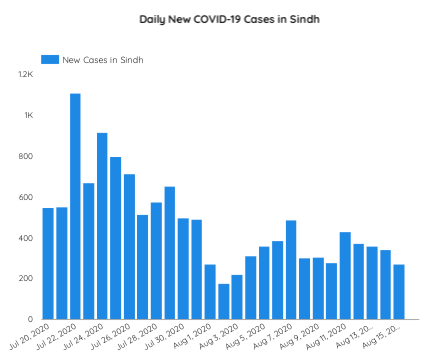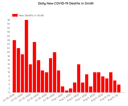 On August 15, Karachi reported 117 positive cases (43% of the total new cases), followed by Khairpur (20), Kashmore (19), Hyderabad (18), Thatta (15), Ghotki (7), Jacobabad (5), Sujawal (5), Shikarpur (5), Tando Mohammad Khan (4), Badin (3), Jamshoro (3), Mirpurkhas (3), Naushero Feroze (3), Sanghar (3), Sukkur (3), Tando Allahyar (3), Larkana (2), Kambar Shahdadkot (1), Matiari (1), Shaheed Benazirabad (1) and Umerkot (1).