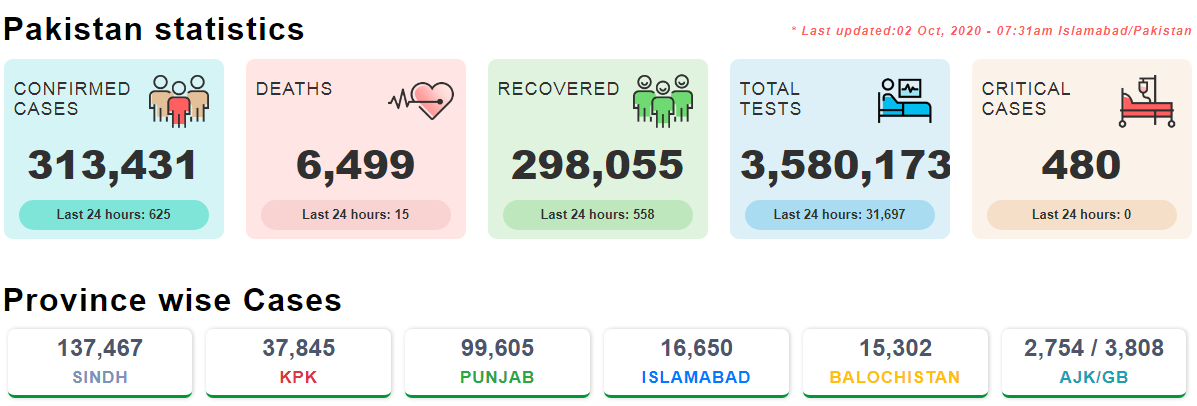 Sindh’s daily infection rate was recorded as 3% on October 1 against Pakistan’s daily rate of 2%. New cases were reported from Karachi (249), Badin (19), Hyderabad (12), Dadu (7), Ghotki (6), Jamshoro (5), Mirpurkhas (3), Naushero Feroze (2), Kambar Shahdadkot (2), Larkana (2), Sukkur (2), Matiari (1), Shaheed Benazirabad (1), Shikarpur (1), Thatta (1), and others–PNFS