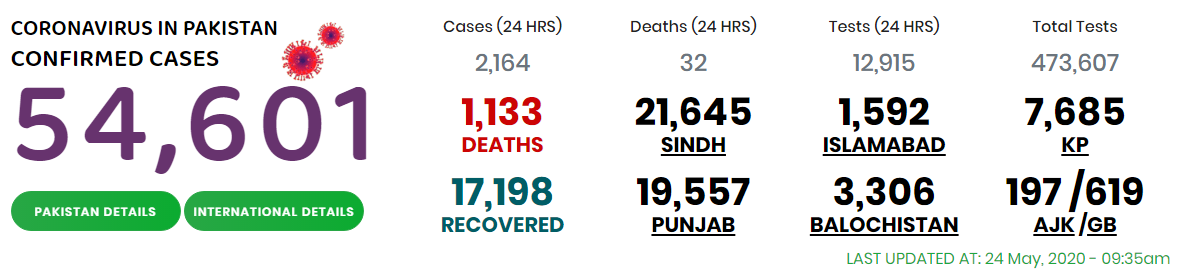 It was learnt that 157,449 samples have been tested across the province so far, out of which 22,491 were detected COVID-19 positive. In addition to Karachi, the districts from where the new positive cases were reported on May 24 included Larkana (24), Ghotki (12), Tando Allahyar (10), Hyderabad (9), Sanghar (8), Kambar-Shahdadkot (7), Jacobabad (7), Thatta (4), while Badin and Jamshoro presented two cases each and Mirpurkhas and Tando Mohammad Khan one cases each.