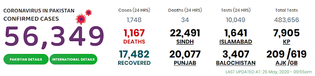 An official data updated on May 25 said that a total of 300 COVID-19 patients have lost their lives in private and public sector hospitals including JPMC (52), DUHS Ojha (48), SIUT (45), AKUH (37), Indus Hospital (30), CHK (26), Ziauddin Hospital (13), LUMHS Hyderabad (10) and other hospitals while remaining patients died at home or during their shifting to hospitals from home.