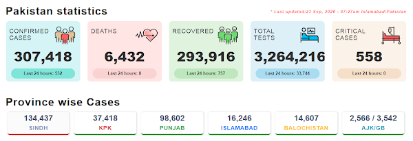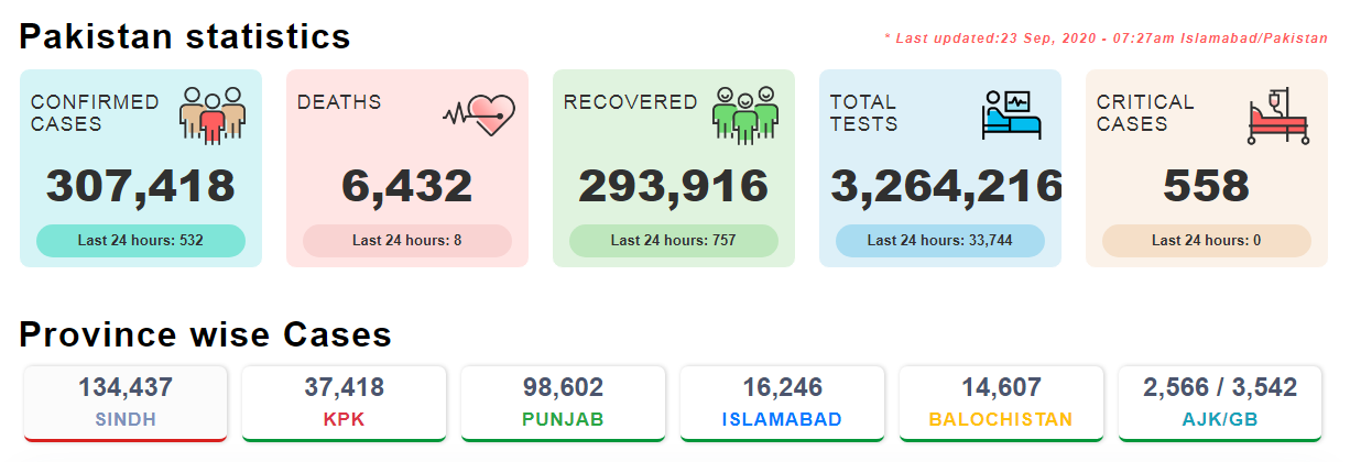 Earlier, according to data, Sindh had reported six deaths on September 1, 2, and 9. Sindh’s six fatalities on September 22 were included in Pakistan’s total 8 of the day, while country’s new number of infections stood at 532.