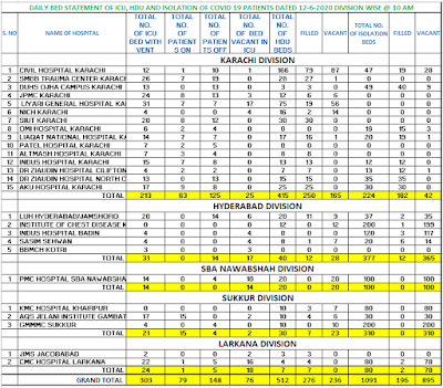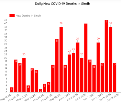 Another official report, update on June 13, revealed that as many as 629 COVID-19 patients died at 32 hospitals across the province so far, including Jinnah Postgraduate Medical Centre (87), Sindh Institute of Urology and Transplantation (87), DUHS Hospital (78), the Aga Khan University Hospital (75), Civil Hospital Karachi (67), Indus Hospital Korangi (64), Ziauddin Hospital Clifton (41), Liaquat University of Medical and Health Sciences Hyderabad (17), Lyari General Hospital (16)), PNS Shifa Karachi (15), Gambat Institute of Medical Science (12) and other hospitals.