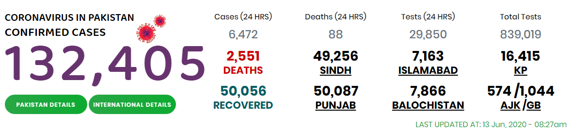As of June 13, the district wise breakdown of total reported cases, since February 26, came as Karachi-six districts (41,355), Hyderabad (1,598), Sukkur (1,546), Larkana (1,196), Ghotki (1,168), Khairpur (935), Shikarpur (515), Jacobabad (386), Shaheed Benazirabad (373), Sanghar (294), Jamshoro (278), Kamber Shahdadkot (235), Dadu (229), Kashmore (202), Mirpurkhas (199), Badin (154), Sujawal (117), Tando Mohammad Khan (109), Thatta (85), Naushehro Feroze (85), Matiari (75), Tharparkar (71), Umerkot (45) and Tando Allahyar (39).