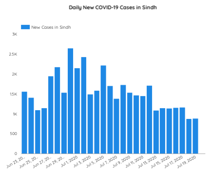 Karachi reported the maximum of 395 cases on July 19, followed by Hyderabad (59), Ghotki (42), Mirpurkhas (32), Khairpur (25), Shaheed Benazirabad (22), Shikarpur (21), Sanghar (19), Larkana (19), Jamshoro (16), Dadu (15), Jacobabad (14), Sukkur (13), Kashmore (12), Thatta (11), Kanbar Shahdadkot (11), Naushero Feroz (11), Matiari (10), Tando Allahyar (8), Sujawal (5), Badin (5) and Umerkot (4).