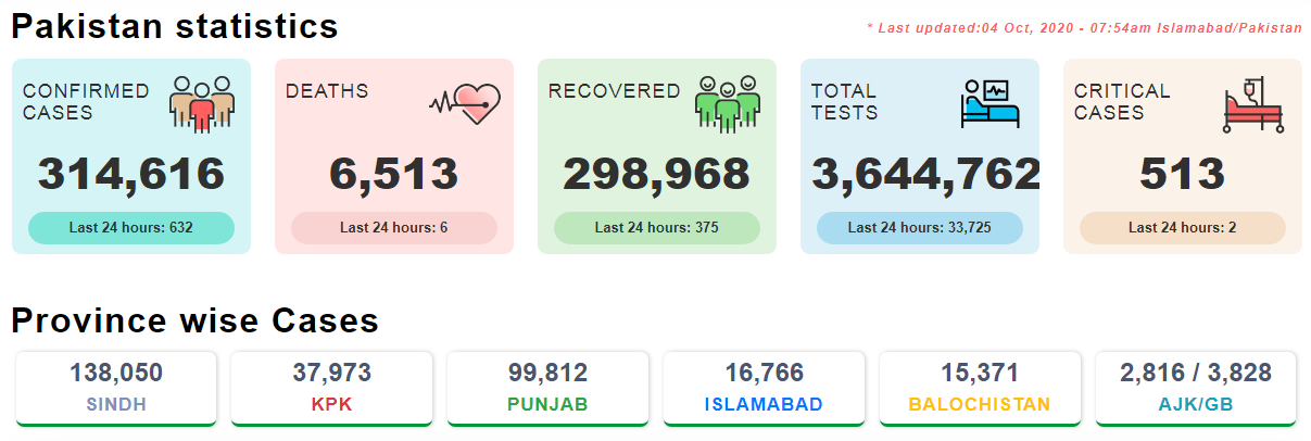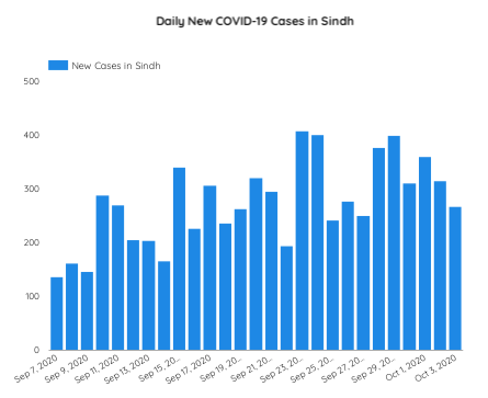 In the meantime, three more patients died of COVID-19 on October 3, taking the total of relevant fatalities to 2,520 for Sindh and 6,513 for Pakistan.