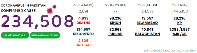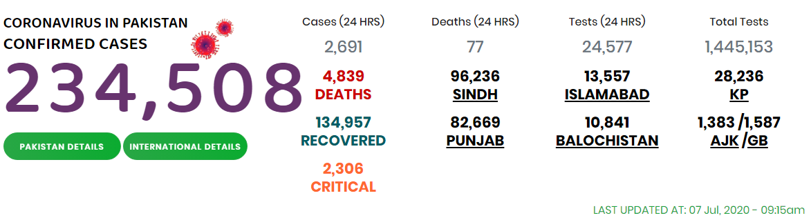 As many as 1,038 new people were tested positive for coronavirus at Karachi on July 6, followed by Hyderabad (191), Sukkur (107), Shaheed Benazirabad (48), Sanghar (42), Naushero Feroze (35), Tando Allahyar (34), Khairpur (30), Mirpurkhas (25), Larkana (22), Kambar Shahdadkot (21), Jamshoro (21), Sujawal (19), Matiari (16), Shikarpur (15), Tando Mohammad Khan (21), Ghotki (8), Thatta (6), Dadu (3), Kashmore (3) and Jacobabad (2)–PNFS