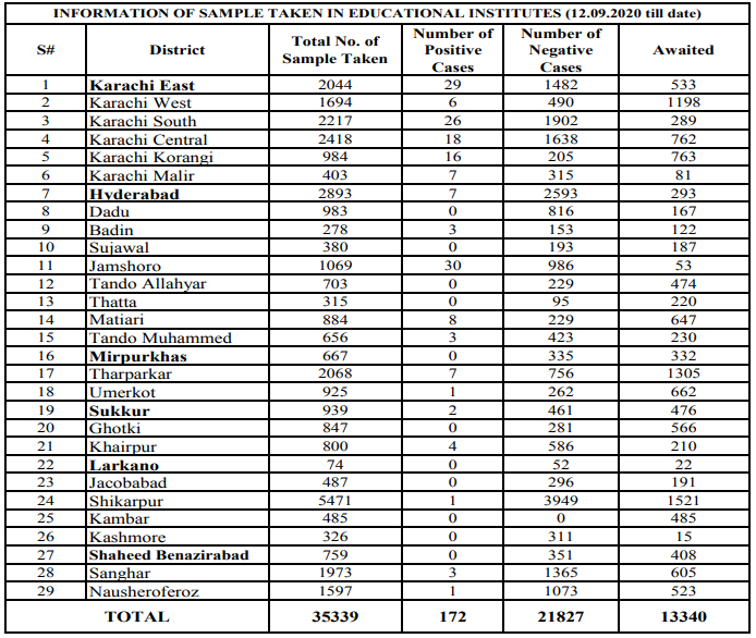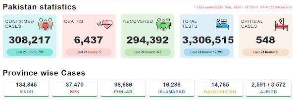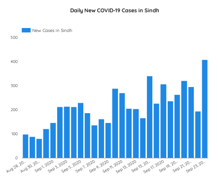Sindh reported 408 new infections during the last 24 hours ending September 23 morning, against Pakistan’s total 799 new positive cases detected out of 42,299 samples, with five deaths.