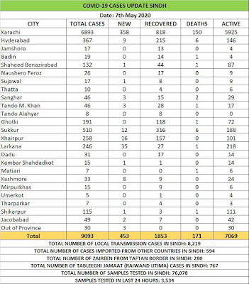 The number of COVID-19 cases rose to 6,893 in Karachi, with 358 new infections and overall death tally 150 deaths. Larkana reported 35 new cases, followed by Khairpur (16) new cases, Sukkur (12), Hyderabad (9), Kahsmore (8), Sanghar (3), Tando Mohammad Khan (3), Jacobabad (2) while Shaheed Benazirabad, Sujawal, Kambar Shahdadkot, and Shikarpur reported new case each–PNFS