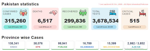The solitary COVID death of Sindh occurred in Hyderabad, which in all had 5119 infections and 77 fatalities, taking the tally of deaths to 2,521 for the province on October 4.