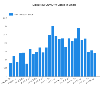 On June 18, Sindh’s new infection rate was 21%, which started dipping on June 20 and was recorded at 15% on June 22. It increased to 24% on June 23 and then went down to 19% on June 24.
