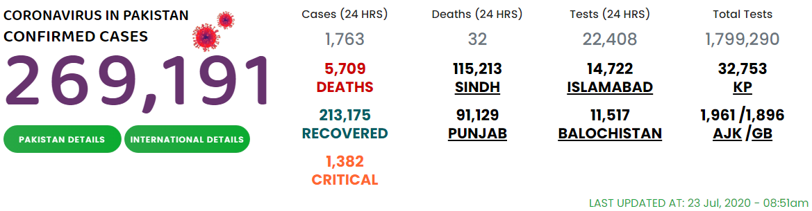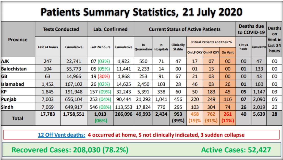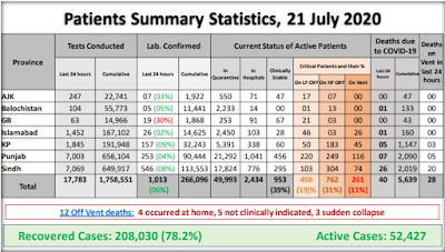 According to another report, overall 40 deaths occurred across the country on July 20, including four at-home deaths which were reported from Sindh. It was estimated that about 500 COVID-19 patients died at home or on their way to hospitals in Sindh so far.