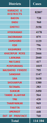 In addition to Karachi, the districts where new cases were confirmed during the last 24 hours ending July 22 morning included Hyderabad (95), Tando Allahyar (26), Thatta (26), Sukkur (25), Matiari (23), Badin (21), Jacobabad (15), Jamshoro (14), Larkana (11), Sujawal (13), Shikarpur (11), Ghotki (9), Umerkot (9), Kambar Shahdadkot (8), Tando Mohammad Khan (4), Tharparkar (3), Shaheed Benazirabad (2), Khairpur (2) and Mirpurkhas (1).