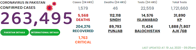 The Sindh Chief Minister, Syed Murad Ali Shah, in his daily statement related to COVID-19 status on July 18, informed that there were 18,761 infected people, who were receiving treatment at homes or isolation centres and hospitals across the province.