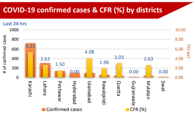 The breakdown of districts, excluding Karachi, which reported new COVID-19 cases during the last 24 hours came as: Shaheed Benazirabad (74), Hyderabad (71), Ghotki (71), Khairpur (56), Tando Allahyar (54), Jamshoro (52), Sukkur (48), Kashmore (41), Thatta (39), Kambar Shahdadkot (28), Mirpurkhas (28), Tando Mohammad Khan (23), Naushero Feroze (22), Mirpurkhas (21), Sujawal (21), Larkana (16), Shikarpur (15), Badin (15), Umerkot (11), Tharparkar (11), Jacobabad (7), Sanghar (6) and Dadu (5).