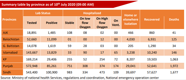 Sindh recorded a total of 102,368 COVID-19 cases till July 10, out of which 59,165 recovered from the diseases, while 1,069 were still in in critical condition. The death tally rose to 1,713.