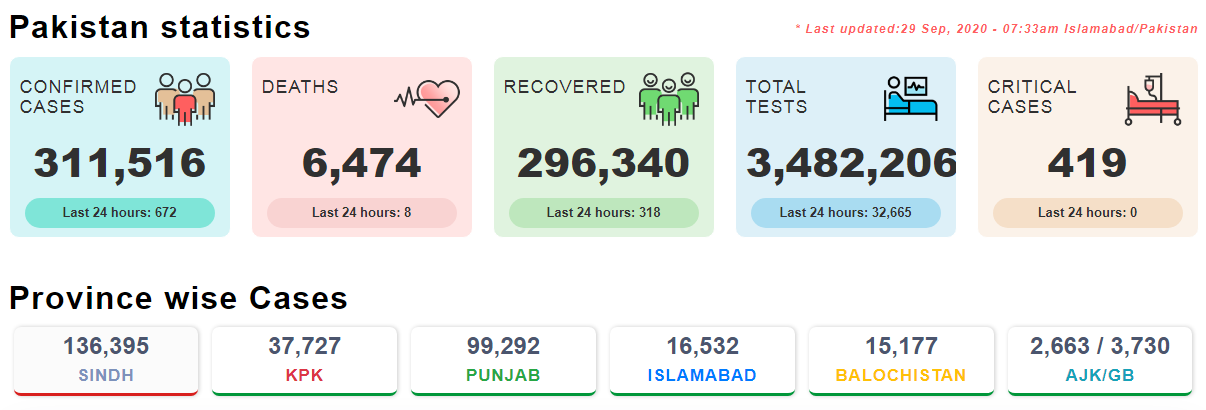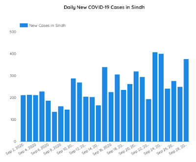 A maximum 300 (79%) new findings pertained to Karachi’s six districts, including South (109 cases), East (92), Korangi (45), Central (25), Malir (25) and West (4). The other districts that reported new cases during the 24 hours ending 8 am on September 28 included Hyderabad (16), Badin (13), Dadu (2), Shikarpur (2), Sukkur (2), Ghotki (1), Mirpurkhas (1), Sanghar (1), Tando Allahyar (1), Tando Mohammad Khan (1), and others.