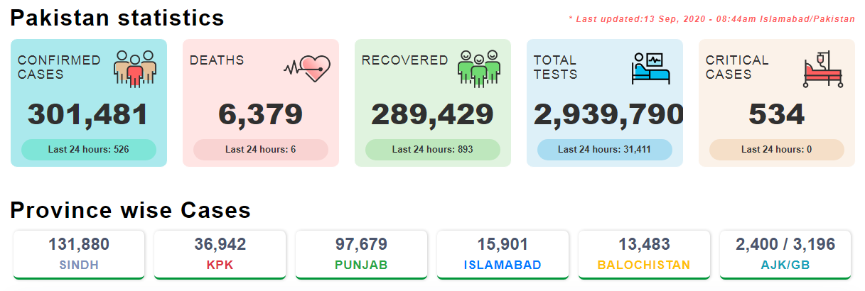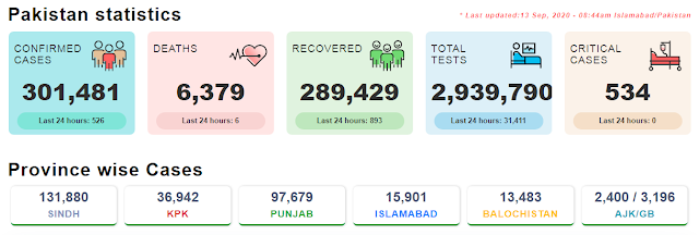 Karachi reported 123 (60%) of the new cases detected in the province during the last 24 hours, followed by Badin (17), Shikarpur (8), Hyderabad (4), Jacobabad (4), Kashmore (4), Larkana (3), Matiari (3), Mirpurkhas (3), Sanghar (3), Thatta (3), Dadu (2), Sukkur (2), Naushero Feroze (2), Shaheed Benazirabad (2), Sujawal (1), Tando Allahyar (1), Khairpur (1) and others. Three new deaths were registered in Karachi East (2) and Karachi South (1), which had 402 and 399 active patients, respectively, as of September 12. Karachi has reported in all 2,034 deaths, as of September 11–PNFS