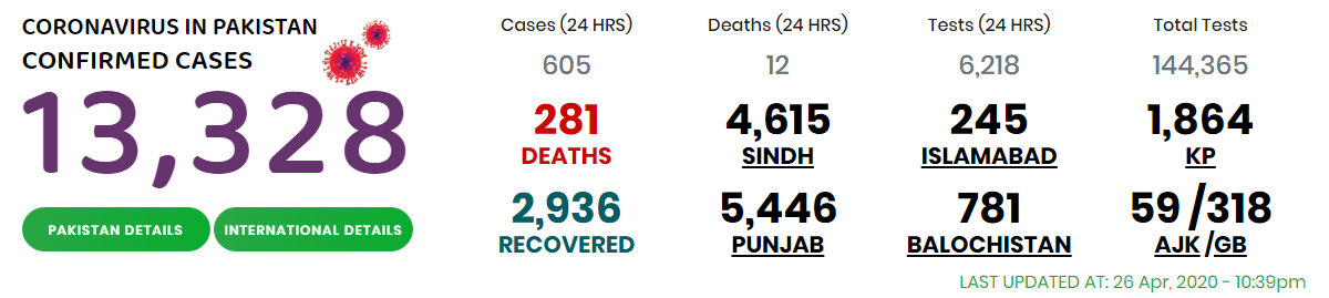 While the virus has spread in all districts, the breakdown of total reported cases was: Karachi-six districts (3,249), Sukkur (409), Hyderabad (263), Khairpur (169), Ghotki with no new case (124), Larkana (108), Shaheed Benazirabad reporting no new case (84), Tando Mohammad Khan with no new case (32), Sanghar (26), Naushehro Feroze (23), Shikarpur with no new case (17), Dadu (15), Jamshoro (15), Badin (15), Jacobabad with no new case (11), Sujawal with no new case (9), Mirpurkhas (9), Kashmore with no news case (9), Tando Allahyar (8), Thatta (6), Umerkot with no new case (4), Tharparkar with no new case (4), Kamber Shahdadkot with no new case (4) and Matiari (2).