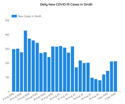 On September 3, new infections were reported from Karachi (119), Thatta (13), Badin (12), Dadu (4), Jamshoro (4), Mirpurkhas (4), Shikarpur (4), Tando Mohammad Khan (4), Naushero Feroze (4), Umerkot (3), Kambar Shahdadkot (3), Shaheed Benazirabad (2), Ghotki (2), Larkana (2), Hyderabad (2), Matiari (1), Sanghar (1), Khairpur (1), Sukkur (1), Tando Allahyar (1) and others–PNFS