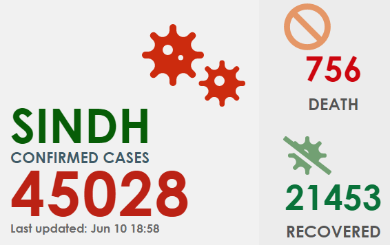 According to official statement, Karachi reported 1,755 new infections on June 10, followed by, Sukkur (344), Hyderabad (80), Ghotki (69), Larkana (40), Sanghar (37), Khairpur (29), Jamshoro (25), Dadu (25), Sujawal (23), Kashmore (22), Shikarpur (17), Mirpurkhas (13), Thatta (12), Tharparkar (11), Kambar Shadadkot (11), Umerkot (9), Jacobabad (8), Badin (4) and Tando Allahyar (1).