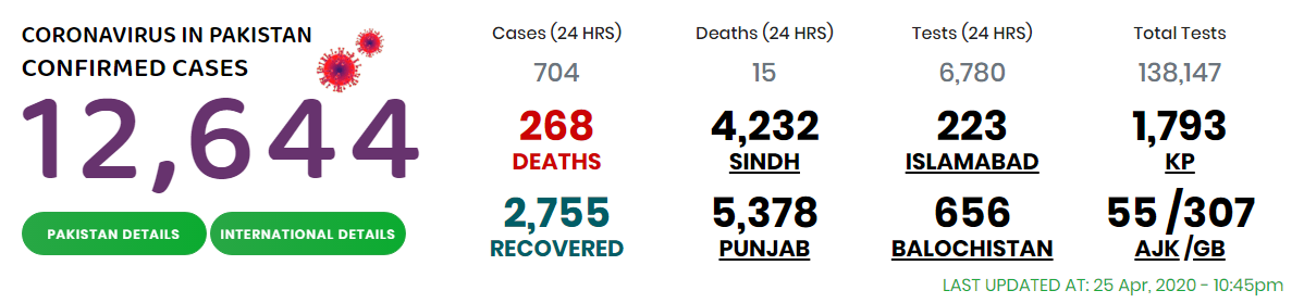 The official COVID-19 data, updated at 10.45 pm on April 25, showed Pakistan had total 12,644 confirmed cases of infection out of 138,147 samples tested across the country, while Sindh had overall 4,232 COVID patients after testing 38,188 people across the province since February 26 when the first coronavirus positive case was found in Sindh as well as Pakistan.