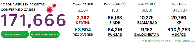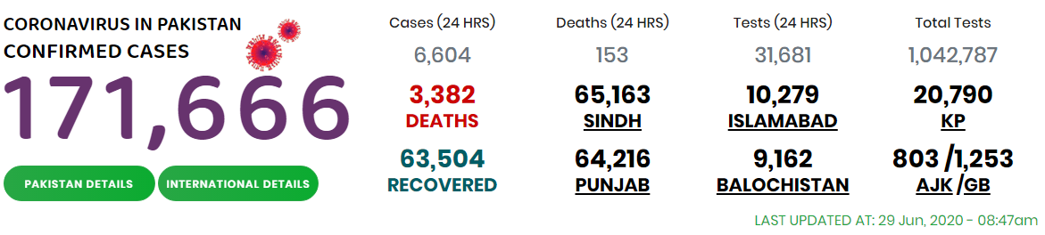 A maximum 2,296 new infections were confirmed at Karachi, including District East (471 new cases), South (413), Central (255), Korangi (150) and West (124 cases). Among other districts, Khairpur registered 165 new cases, taking its infection tally to 1297, with seven deaths, followed by Hyderabad (65 new cases, with overall 37 deaths), Jamshoro (62, with 2 deaths), Tharparkar (51), Ghotki (46, with 6 deaths), Sukkur (30, 16 deaths), Thatta (26, with 4 deaths), Naushero Ferroze (22, with 3 deaths), Larkana (20, with 19 deaths), Sanghar (18, with 8 deaths), Dadu (16, with 4 deaths), Shaheed Benazirabad (16, with 3 deaths), Kambar Shahdadkot (11, with 6 deaths), Shikarpur (9, with 11 deaths), Jacobabad (7with 2 deaths), Kashmore (7, with 5 deaths), Mirpurkhas (7, with 4 deaths), Matiari (5, with 2 deaths), Umerkot (5), Tando M Khan (3, with one death), Tando Allahyar (3), Badin (2, with 5 deaths) and Sujawal (2, with 3 deaths).