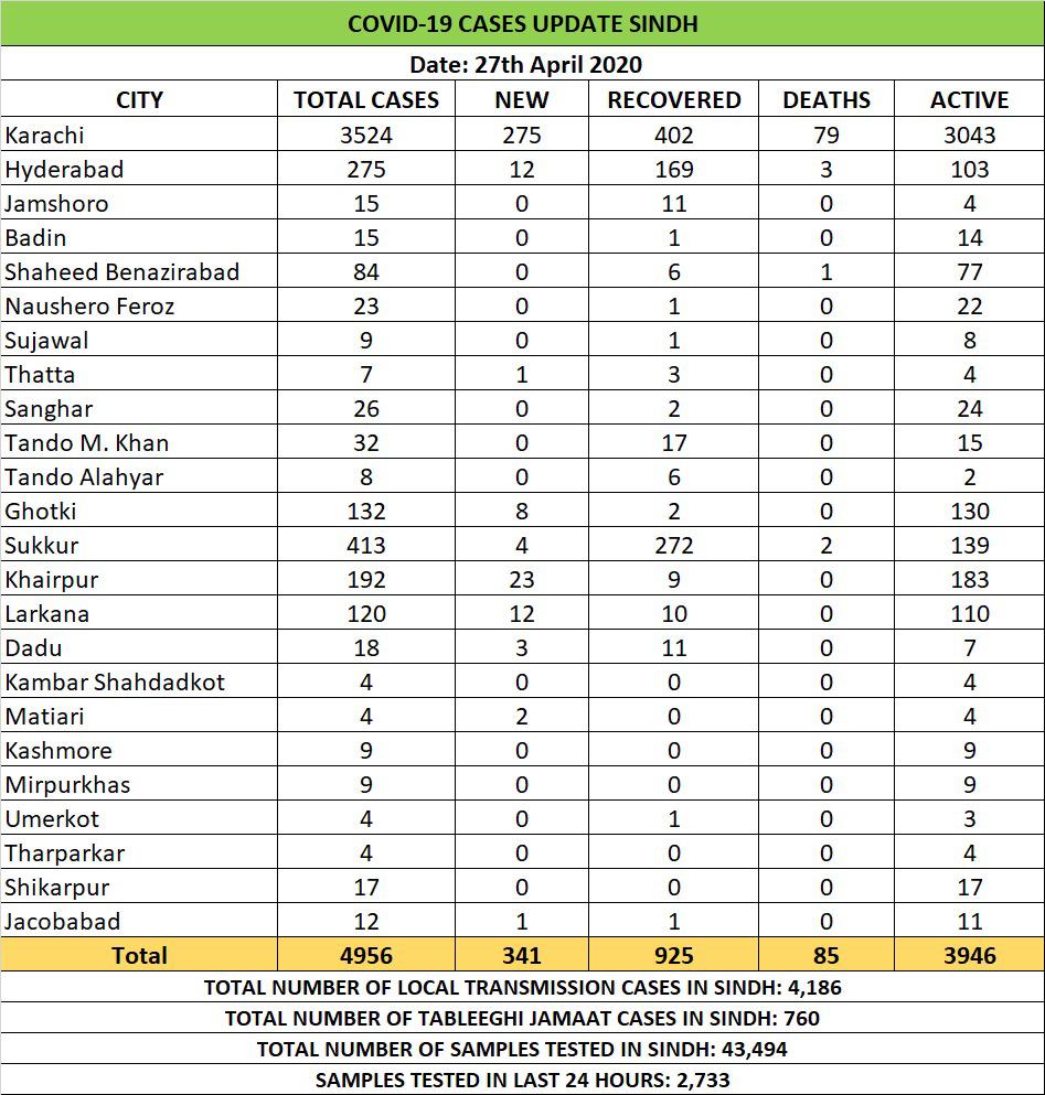 KARACHI: The tally of coronavirus positive cases in Sindh reached to 4,956, with 85 related deaths, as another 341 new cases were reported from across the province, with 4 deaths on April 27.