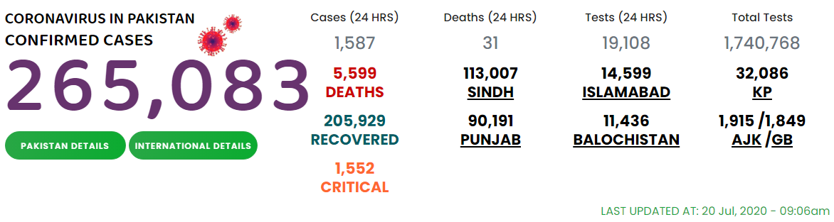 On the other hand, a Sindh health department website updated the number of fatalities as 2,016 around 8 pm on July 19. This website showed the total COVID cases of Karachi as 74,647–PNFS